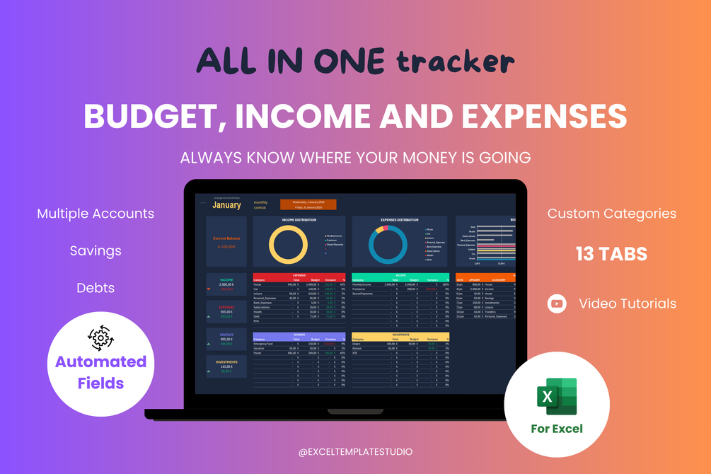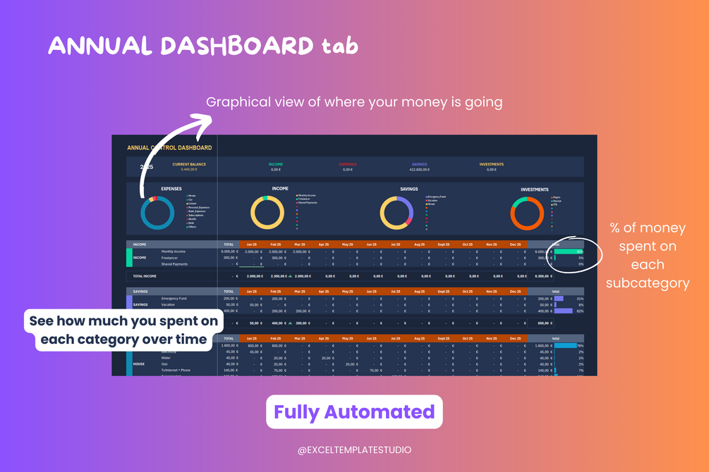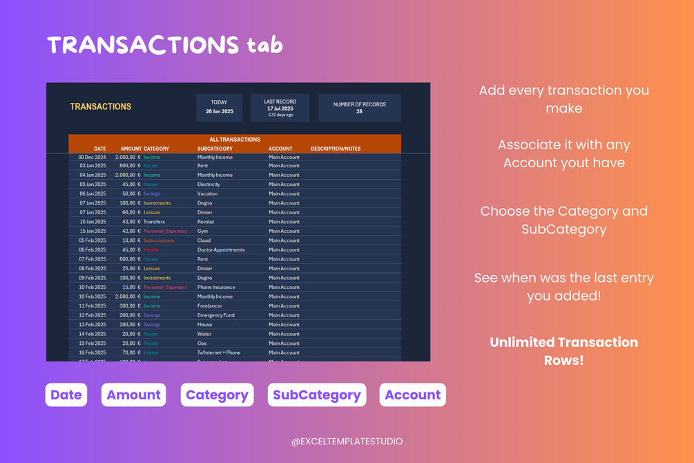 This Excel template is the ultimate tool to take the next step in managing your personal finances, easy to use, full with automations, all you need to do is set it up once and add your transactions everytime you make them! (Pro tip: do it minimum once a week for quick inserts)