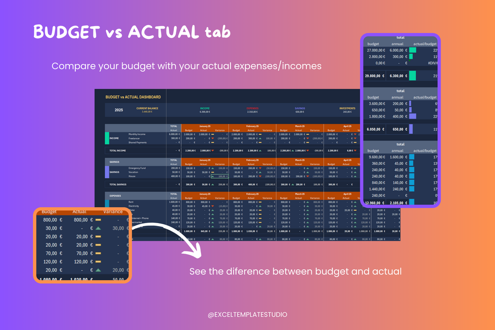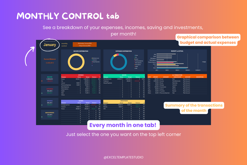 • 13 TABS – Index, Instructions, Transactions, Budget, Annual Control, Budget vs Actual, Monthly Control, Annual Overview, Accounts, Savings, Debts, Categories, Setup